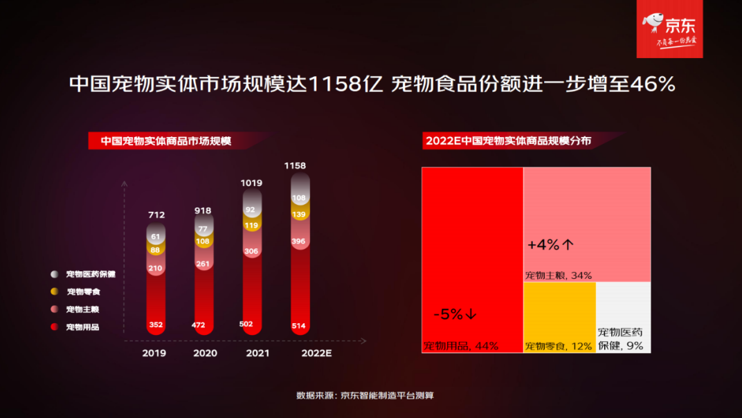 近日,京東(dong) 寵物正式發布完整版《2022年中國寵物行業(ye) 趨勢洞察白皮書(shu) 》。總體(ti) 來看,2022年中國寵物實體(ti) 市場規模將達1158億(yi) ,寵物食品份額增至46%,寵物主糧占比34%,成為(wei) 最大細分品類。是頗具前景的藍海市場。