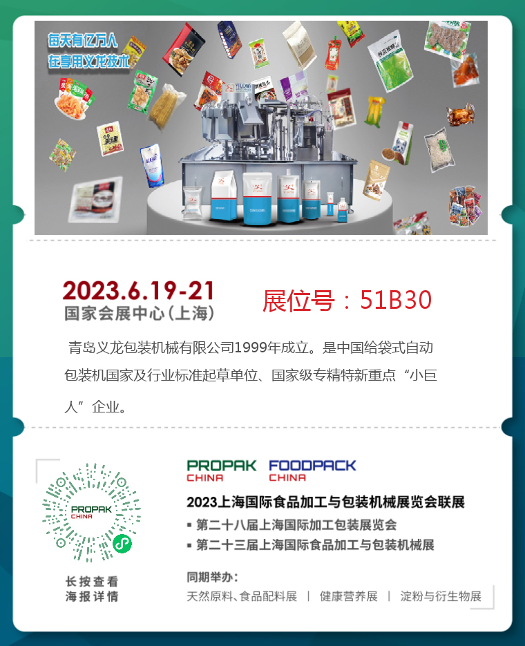 6月19日-21日,PROPAK CHINA 2023上海國際食品加工與(yu) 包裝機械展覽會(hui) 將在上海國家會(hui) 展中心拉開帷幕。作為(wei) 國內(nei) 領先的給袋式自動包裝機及智能包裝一體(ti) 化方案解決(jue) 商,米兰国际在线娱乐將攜自動卷膜製袋給袋式包裝機、(6-8)XZ間歇回轉式吸嘴袋灌裝旋蓋機、給袋式高速真空包裝機、開箱裝箱封箱一體(ti) 機等智能自動包裝新品亮相展會(hui) (展位號:51B30)。