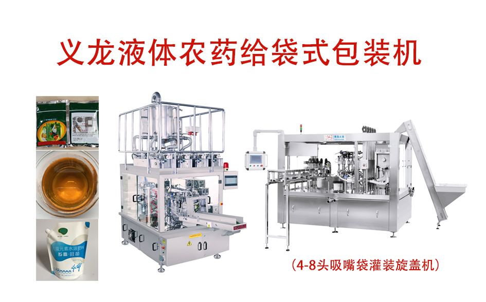 設備優(you) 勢:YL-10SR給袋式自動包裝機可搭配伺服灌裝機進行液體(ti) 農(nong) 藥的自動包裝,包裝能力20-50包/分鍾。當產(chan) 量需求高的情況下,可以使用YL-(4-8)XZ間歇回轉式吸嘴袋灌裝旋蓋機來進行包裝,包裝能力可達60-130包/分鍾。義(yi) 龍吸嘴袋灌裝旋蓋機可實現自動掛袋、自動定量灌裝、自動理蓋、自動掛蓋、自動旋蓋、自動輸出。