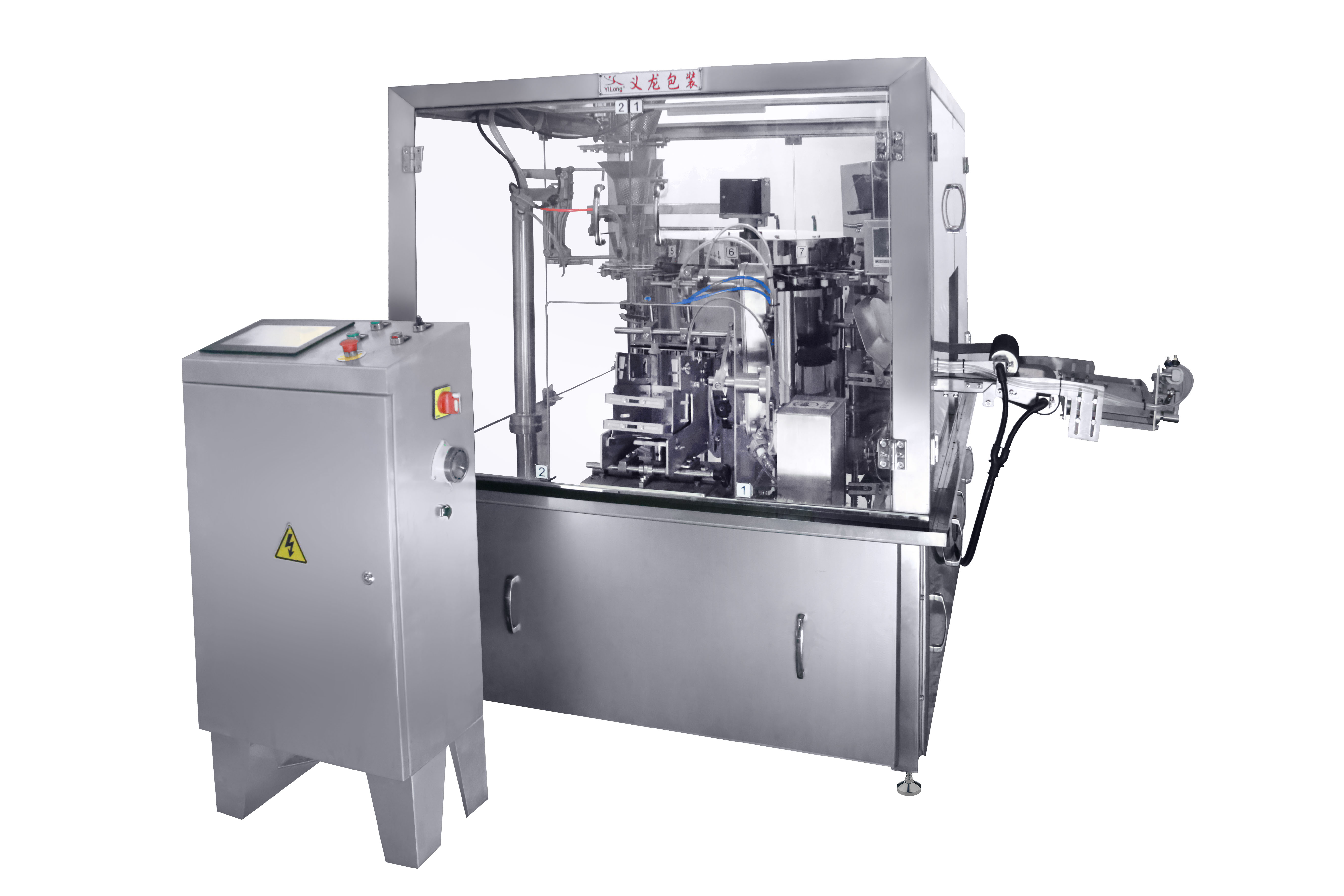 ●采用世界穩定的凸輪機械傳(chuan) 動技術,使設備運行更加快速穩定;故障率、耗能低、耐用耐磨性強。 ●機械維護、檢修方便:設備主要部分采用機械傳(chuan) 動,多數采用含油軸承,減少了注油的部位,維護簡單。 ●安裝方便、操作簡單。采用PLC觸摸屏操作界麵,全過程都實現自動化控製。主機調速采用變頻調速器調速。 ●本機特別設計了整形工位,使封口平整無折皺,故包裝袋圖案完整、封口質量好、破包率極低,可降低包裝袋損耗。